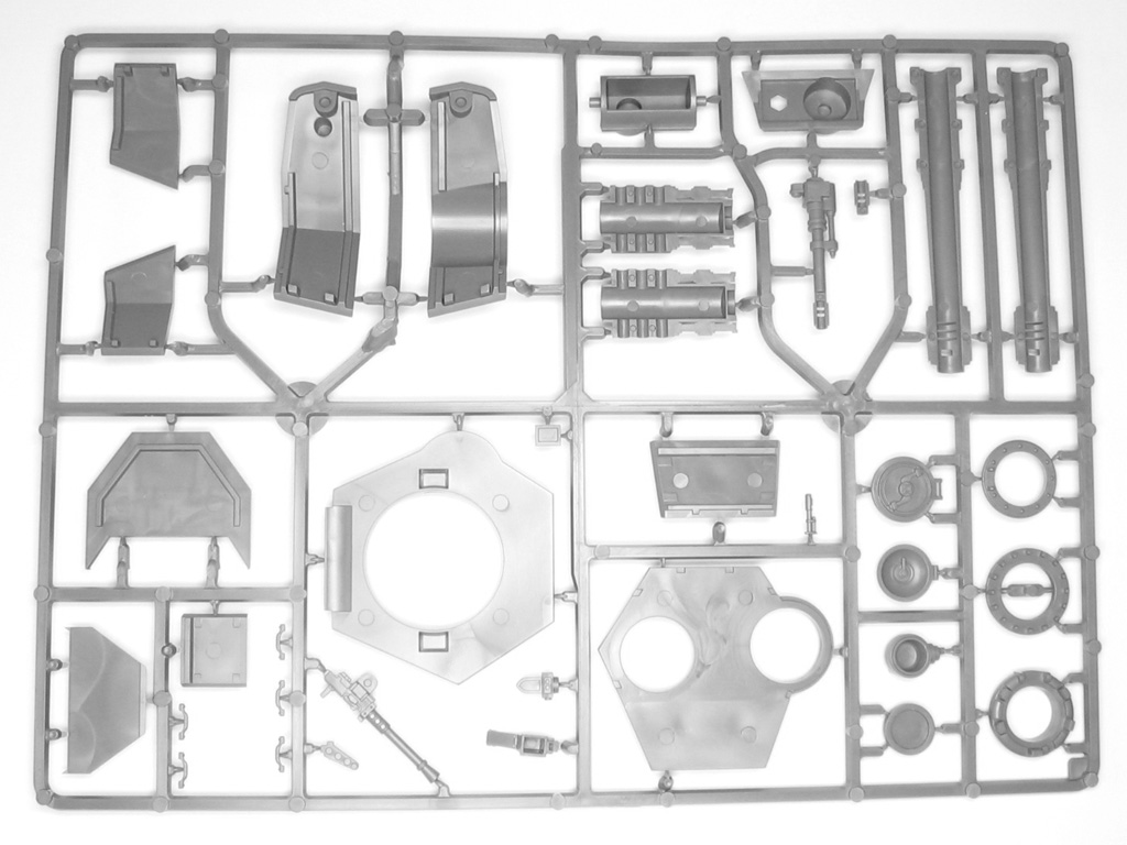 Die Seitenkuppeln verfügen über einige Kleinteile, sind aber auch zügig zusammengebaut. Dabei hat man die Auswahl zwischen synchronisierten schweren Bolter und schweren Flammenwerfern. Hier sollte man nicht alle Teile zusammenkleben, damit die Kuppeln und Waffentürme beweglich bleiben.