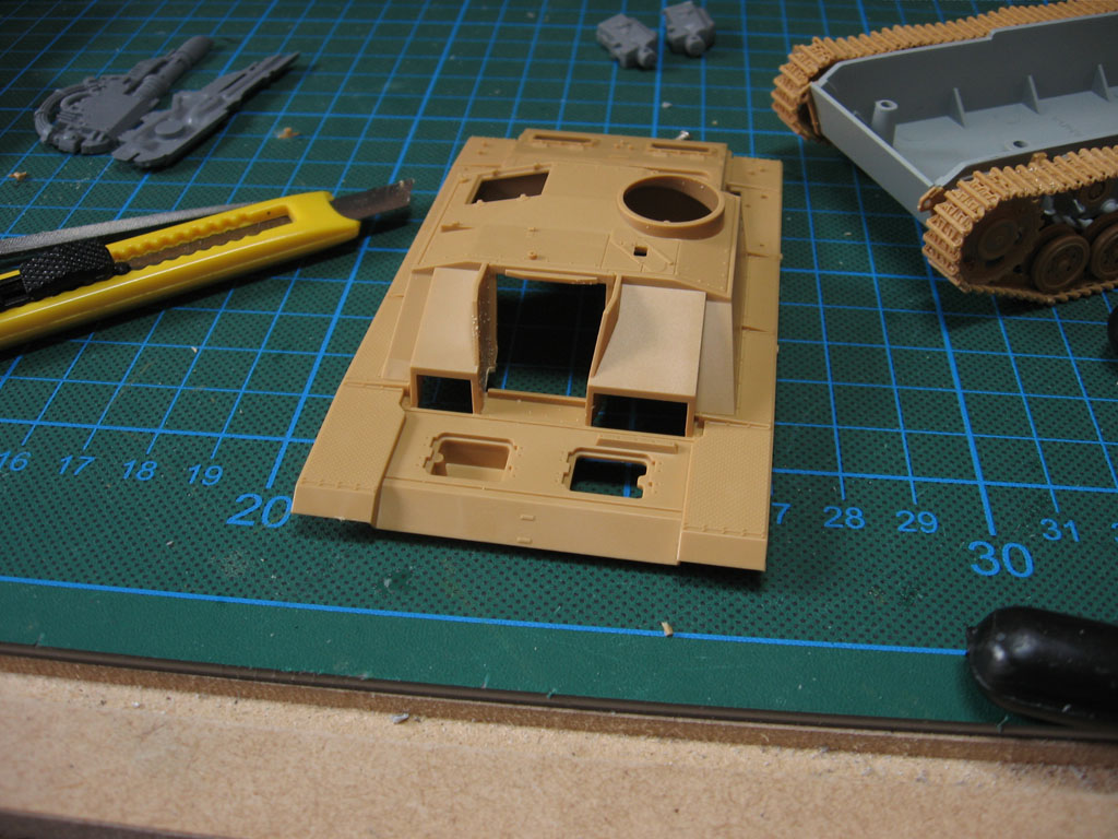 Interessant ist, dass die Hülle des Panzers nicht auf das Chassis geklebt sondern verschraubt wird. Die Schraubstellen werden später mit Abdeckplatten überklebt und sind im Nachhinein nicht mehr zu erkennen.