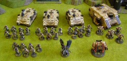 Wählt nicht nur die „besten“ Einheiten jeder Kategorie sondern überlegt euch, welche Truppen charakteristisch für die Kriegsführung eurer Fraktion sein könnten. Der Hintergrund liefert meistens genügend Anhaltspunkte. So wissen wir beispielsweise, dass Eldar vom Raumschiff Ianyden über eine große Zahl an Phantomkriegern und –lords verfügen, was man schön auf das Spielfeld übertragen kann. Oder man denke eine Armee der Imperial Fists, die als Belagerungspezialisten Ironclad Cybots zum Breschen schlagen und schweres Geschütz wie Salvenkanonen und Vindicatoren ins Feld führen. Ein anderer Ansatz ist es, die Armee um ein bestimmtes Charaktermodell herum zu stricken. Viele Helden der letzten Bücher verändern den Armeeorganisationsplan und bieten so weitere Möglichkeiten. So kann beispielsweise mit Dante eine Streitmacht ins Feld führen, die fast nur aus der Sanguinischen Garde besteht.