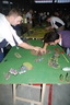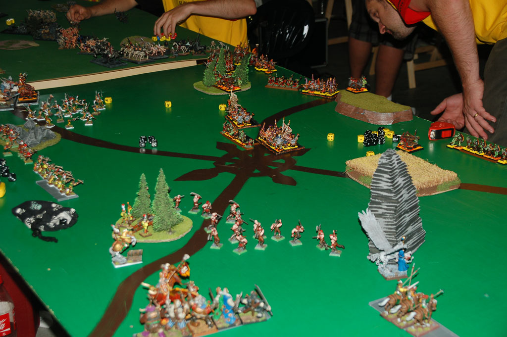 Ich bin erstaunt. Im Durchschnitt sehen die Armeen – zumindest auf die Entfernung – alle durchweg recht ordentlich bemalt aus… Man sieht keine der üblichen zusammengestöpselten Turnierarmeen mit den drei Farben für „gilt als bemalt“, von 10 Freunden zusammengeliehen oder den unpassenden Modellen aus dem Überraschungsei, weil der große Dämon viiiiel zu teuer war nur weil man ihn auf einem Turnier spielen will. Da falle ich ja fast von meinem Glauben in die Turnierszene ab! 😉
