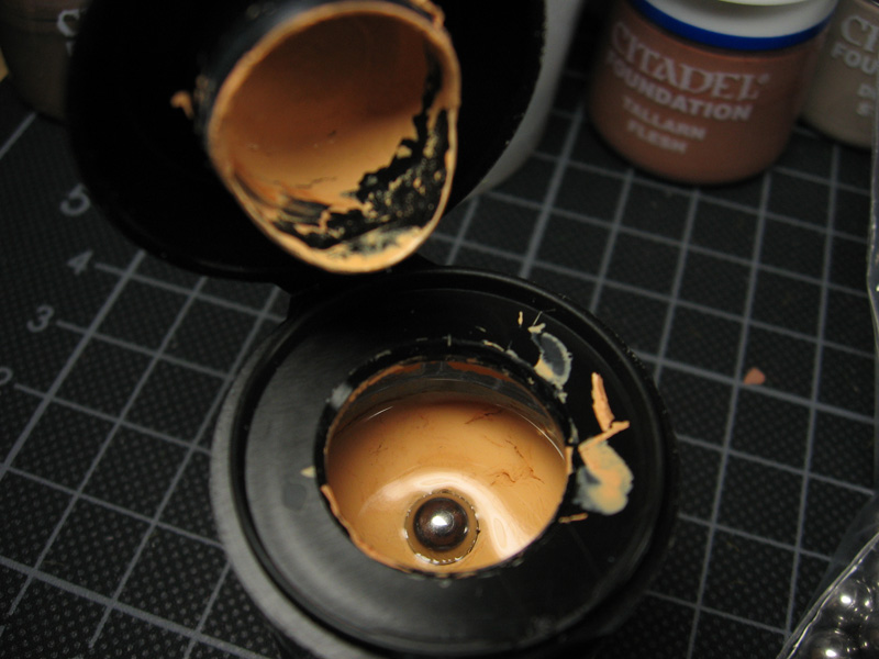 Das Beispiel zeigt eine Citadel Farbe, bei der sich über der Farbe das Medium bereits separiert hat. Hier wurde eine kleine Kugel verwendet. Bevor man die Kugel (bzw. generell eine Mischhilfe) in die Farbe gibt, sollte man allerdings prüfen ob die Farbe nicht bereits festgetrocknet ist. Die Farbe darf zwar etwas zähflüssiger sein, aber feste Farbe kann auch die Kugel nicht wieder fit machen.