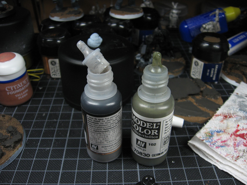 Vor etwas über einem halben Jahr habe ich mein gesamtes Farbsortiment (rund 30 bis 40 Farben von GW und Vallejo) mit Kugellagerkugeln präpariert (oder besser: versaut), mit dem Effekt, dass einige Farbtöne (unabhängig vom Hersteller) mit den Kugeln reagiert haben. Am Boden der Farbtöpfe haben sich hässliche, rostfarbene Verfärbungen gebildet und das Weiß z.B. entwickelt sich langsam richtung Creme. Ganz hässliche Sache das.