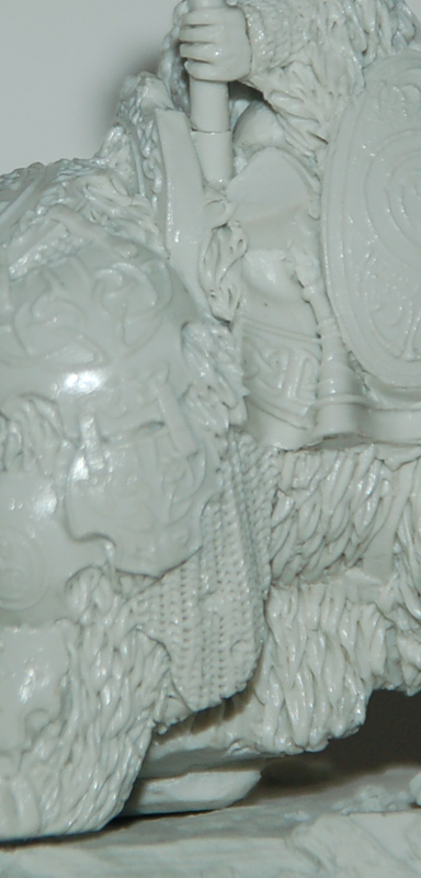 Die Details des Bärenfells und der Zwergenrüstung sind sehr fein gegossen und absolut scharf. Waffe, Krone und die Rüstungen des Königs und des Bären sind mit der Scibor-typischen Stempeltechnik gestaltet worden und voller feiner Linien und Symbole. Dieser massive Gebrauch der Stempeltechnik wird Scibor häufig vorgeworfen, aber hier passt es und angesichts des Felle und des Umhangs des Königs nimmt sie auch nicht Überhand.