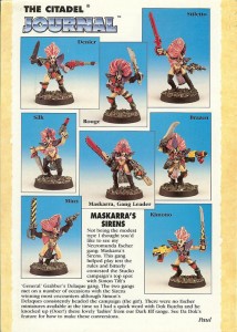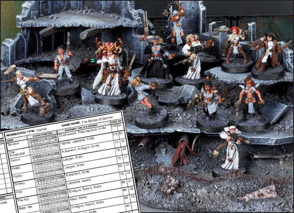 Das war der einfache Teil, aber was machen wir nun mit den Hausgangs? Hier muss man tatsächlich Abstriche machen, denn den Stil der Originalmodelle wird man keinesfalls auch nur annähernd erreichen, aber das ist nicht so schlimm, denn nach mehreren Generationen in der Unterwelt entfremden sich die Ganger ja auch zunehmend von ihren Häusern. In einer hauseigenen Kampagne der Fanatic-Redaktion gab es einmal ein paar Umbauten zu sehen. Eine Escher-Gang aus allerlei weiblichen (oder geschlechtumgewandelten männlichen) Modellen aus der Fantasy- und 40k-Palette und eine Orlock-Gang aus Milizen des Imperiums und allerlei Bitz der imperialen Armee. Tatsächlich kann man aus Hexenkriegerinnen so einiges für die Escher-Gangs umbauen, aber alle anderen gezeigten Vorschläge erfordern schon einiges an Geschick und Kreativität. Die Idee, aus Hexenkriegerinnen Escher-Gangerinnen zu basteln ist übrigens schon sehr alt. Bereits 1997 wurde ein entsprechendes Bild im Citadel Journal (Ausgabe 19) veröffentlicht.