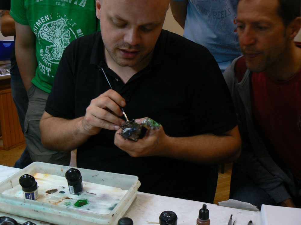 Roman hatte nicht nur seine Farben mit im Gepäck sondern auch einige seiner beeindruckenden Vitrinenstücke und Raffaele ‚Picster’ Picca. Raffa stand Roman bei der Betreuung der Kursteilnehmer zur Seite. In der übrigen Zeit konnte man ihm bei der Bemalung seines Golden Deamon Beitrags beobachten- was wirklich beeindruckend war.