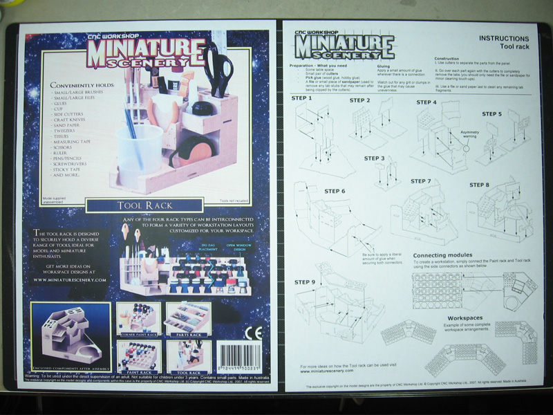 Es gibt zwar verschiedene Organisationsmöglichkeiten und Werkzeughalter auf dem Markt, aber wirklich auf den Bedarf des Hobbyisten ist nur weniges zugeschnitten. Da punkten diese beiden Produkte von Miniature Scenery. Zwar ist es keine Fertig aus der Box Lösung, aber die kurze Aufbauzeit und leicht verständlichen Anleitungen lassen auch ungeübte Heimwerker schnell ein paar Racks zusammenbauen.