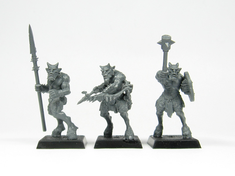 Die alten Posen wurden um neue ergänzt, die Miniaturen überarbeitet und haben nun schärfere Details. Insgesamt wirken die Ungors sehr dynamisch und stärken vor allem mit den neuen Kurzbögen die Ähnlichkeit zu den Satyren. Die Größe ist mit der letzten Edition gleichgeblieben aber deutlich gewachsen im Vergleich zu den alten Zinnmodellen, wie man hier neben einem alten Bestigor aus Zinn sieht.