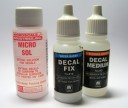 Doch es geht auch anders! Verschiedene Firmen, hauptsächlich aus dem Modellbau, bieten Fixierer und Weichmacher an, mit dem ihr eure Decals perfektionieren könnt. Fixierer (auch Fix, Setter, Setting Agent etc. genannt) beeinhalten praktisch den gleichen Klebstoff, der sich auf der Rückseite von Abziehbildern befindet, in flüssiger Form. Dadurch haften die Abziehbilder viel besser am Modell und werden widerstandsfähiger. Weichmacher (auch Softener, Solvent etc. genannt) enthält unter anderem Alkohol und löst praktisch das Trägermaterial des Abziehbilds auf, wodurch der Druck fast mit dem Modell verschmolzen wird und sich besser an die Formen des Untergrunds anpasst.