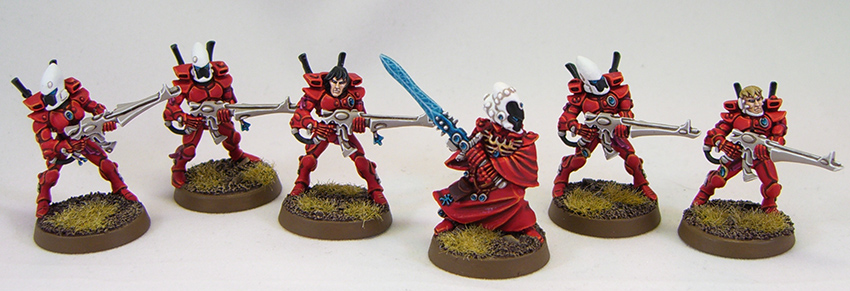 Ähnlich wie Space Marines tragen Eldar Ganzkörperrüstungen. Daher eignen sich für beide Fraktionen die grundsätzliche Technik Grundfarbe auftragen – Schatten malen – Kanten akzentuieren. Typisch für meinen Malstil versuche ich mit einigen Tricks möglichst schnell ein möglichst hochwertiges Ergebnis zu erreichen. Dazu verwende ich eine rote Grundierung und benutze diese gleich als Grundfarbe, außerdem grundiere ich die weißen Helme einzeln, da ein sauberes Weiß zu schichten viel Zeit kostet. Die reine Malzeit beträgt ungefähr knapp zwei Stunden pro Modell, da saubere, gerade Akzente doch etwas Zeit und Geduld benötigen. Zum Glück sind Eldar keine Hordenarmee!