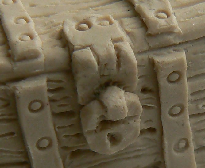 Die Bretter. Um die Bretter darzustellen zieht ihr einfach mit eurem Modellierwerkzeug, oder dem Messer, Rillen in die Kiste. Zieht die Rillen aber nicht mit zu viel Druck, sonst verschiebt ihr alles. Besser ist es mehrmals etwas sanfter drüber zu gehen. Oder ihr drückt die Rillen hinein.