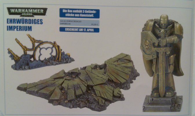 Für 19,50 EUR gibt es eine Space Marine Statue, eine zerstörte Aquila und ein Kathedralfenster.