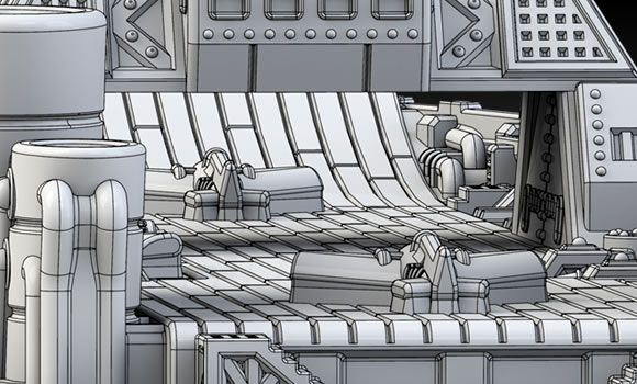 Since we already have the off-the-wall flying gyro carrier for the Japanese, the Assault Carrier was an excuse to introduce some more familiar naval carrier elements into the design, but without compromising the Steam Punk feel of the game or the Japanese aesthetic. The asymmetric design was also interesting to do as I think it really works with the cylindrical shapes of the Japanese fleet.