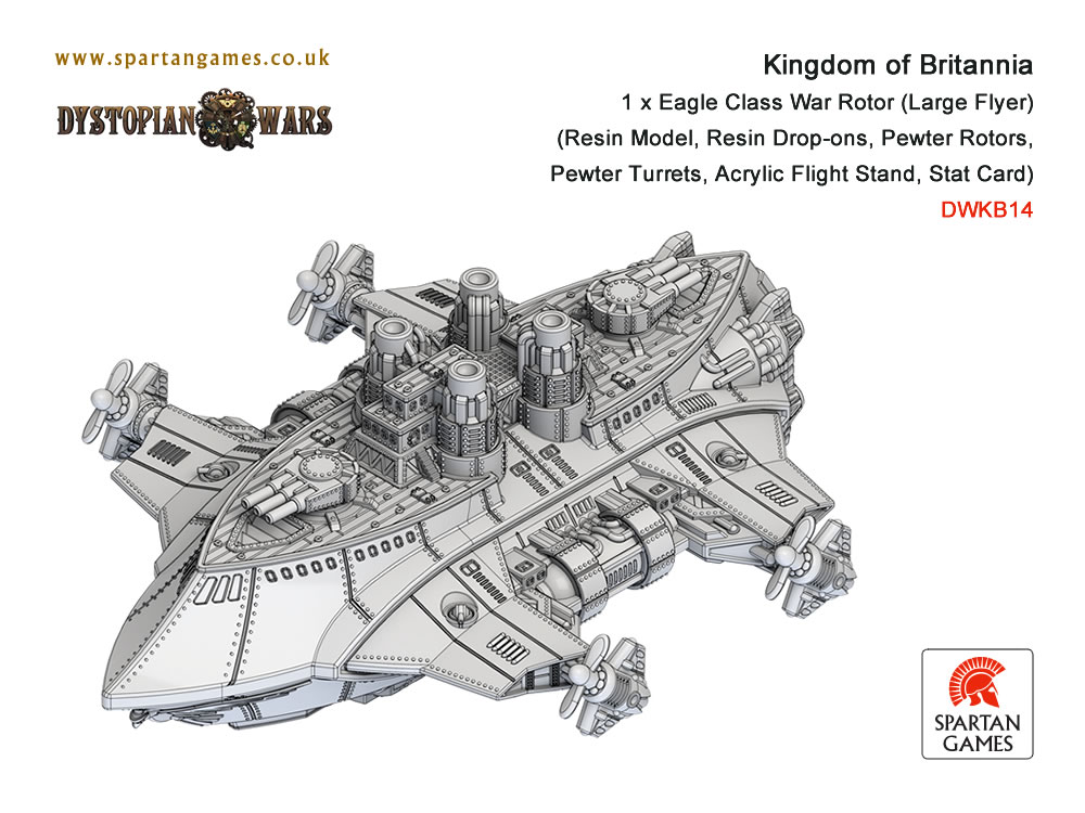 The Prussian Hussar’s role is as obtuse as the Prussian aesthetic, and with two fore mounted turrets and an internal Tesla Generator, it is a ship to be feared from near or far. Deadly on approach and even more deadly within your ranks, the Hussar may lack the complement of assault marines other Prussian ships are known for, but it is by no means a ship to be ignored. Better to sink it fast.DWKB14 Kingdom of Britannia Eagle Class War Rotor