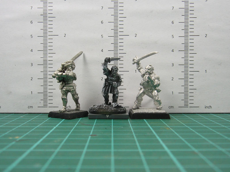 Bei der Größe liegen die Gripping Beast Miniaturen im soliden 28mm Maßstab, bringen es teils auf knapp 30mm von der Sohle bis zum Scheitel. Auf den Bildern sieht man sie sind leicht kleiner wie aktuellere Games Workshop Miniaturen und etwas kleiner als die Freebooter Range. Neben einem Space Marine schneiden sie ganz solide ab.