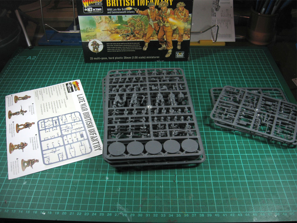 In der Box für 20 GBP sind 25 Soldaten enthalten, verteilt auf 5 Gussrahmen für die Infanterie und 3 Waffen-Gussrahmen sowie ein Informationsblatt.