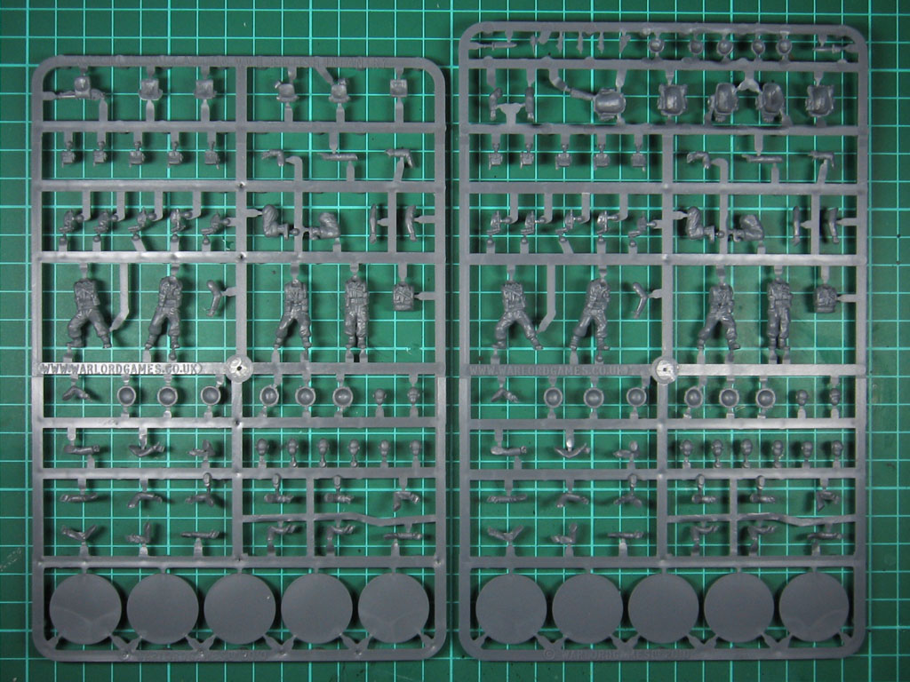 So unterscheiden sich die Gussrahmen wirklich nur im Detail. Es sind zusätzliche Kopfbedeckungen, die Commando-typischen Berets dabei, umfangreichere Rucksäcke und die Kampfmesser. Hier der Direktvergleich mit dem Gussrahmen der britischen Infanterie.