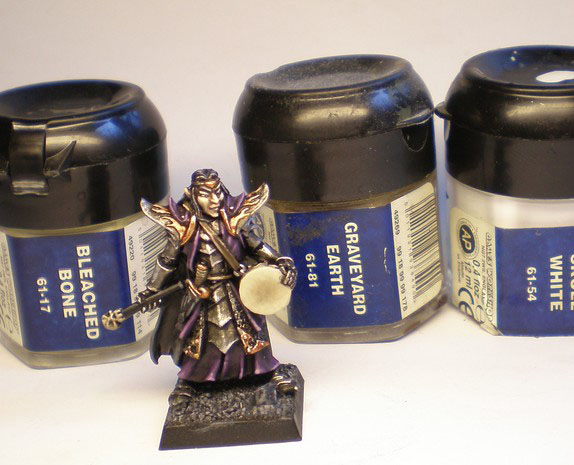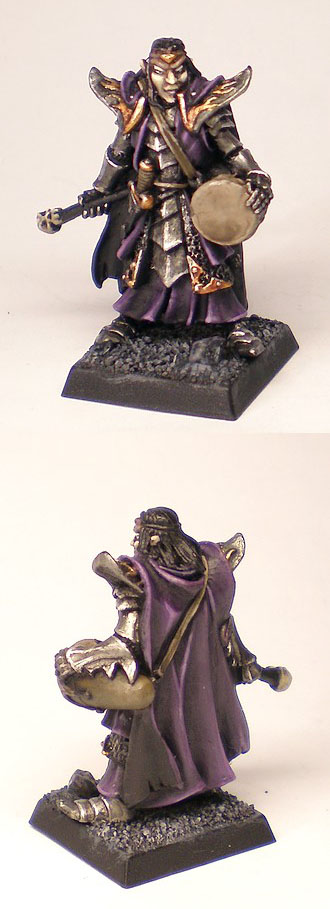 Die Miniatur, die in diesem Guide bemalt wird, ist ein Musiker der Schwarzen Garde aus der Dunkelelfen-Miniaturenserie von Games Workshop die so um 2000 entstanden ist, lässt sich allerdings auf die meisten anderen Dunkelelfen- und ähnliche Miniaturen umlegen.