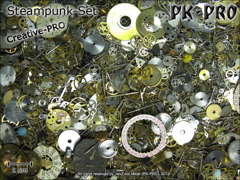 Die Zahnräder kommen als reine Zahnrädersets in 25, 50, 75 und 100 g Sets, wobei die verschiedensten Größen und Formen zu finden sind.Die Steampunk-Sets kommen in zwei grundlegenden Varianten. Es gibt die Steampunk-Sets und die Big-Steampunk-Sets. Der Unterschied ist in den Größen der Zahnräder und den Gewichten der Sets zu finden. Während beide Sets eine Vielzahl von Schrauben, Spannen, Uhren-Bauteilen und Getriebeteilen beinhaltet, hat das Steampunk-Set Zahnräder von 0,3-2,0 cm und das Big-Steampunk-Set Zahnräder von 0,2-6,0 cm inne.