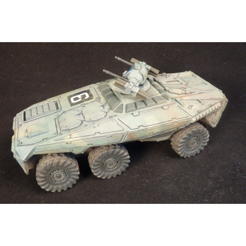 Das APC Hunchback hat ähnliche Maße, ist aber ein gutes Stück länger als der Land Cruiser: Länge 14 cm, Breite 6,3 cm und Höhe 4,8 cm ohne die Turmaufbauten. Mitgeliefert werden zwei Resintürme und unterschiedliche Bewaffnungen aus Weißmetall. Damit kommt der Bausatz auf eigentlich 14 Teile, doch hier erlebten wir die nächste Überraschung, diesmal eine negative: Es fehlen zwei Räder! Nach einer Reklamation bei Antenocitis wurden auch innerhalb einer Woche ein komplettes Set mit sechs Ersatzrädern nachgeliefert. Ob solche Verpackungsfehler häufiger auftauchen können wir an dieser Stelle nicht beurteilen. Zumindest der Support klappt problemlos. Nichtsdestotrotz ist so etwas sehr ärgerlich, besonders wenn man bereits mehrere Wochen auf seine Bestellung gewartet hat. Somit beinhaltet unsere Ausführung: