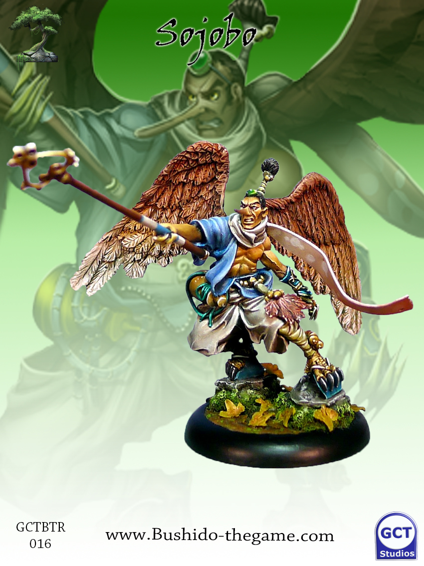 The martial skills of the Tengu are legendary across the Golden Empire. Although few in number the avian Yokais long lives give them ample time to gain mastery of not only the martial but also learn the secrets of the kami who call the mountains their home. Hidden away in their mountain top cities and guarded by the devoted hill tribes few have ever seen these mysterious warriors. What has brought Sojobo down from the mountains and to the aid of the Tengu’s old allies the Temple is not known. Sojobo’s skills in combat are equalled by very few. Now he has spread his great wings and left his mountain home the spirits and prospects of the people of the Ro-Kan can only be lifted as a result.