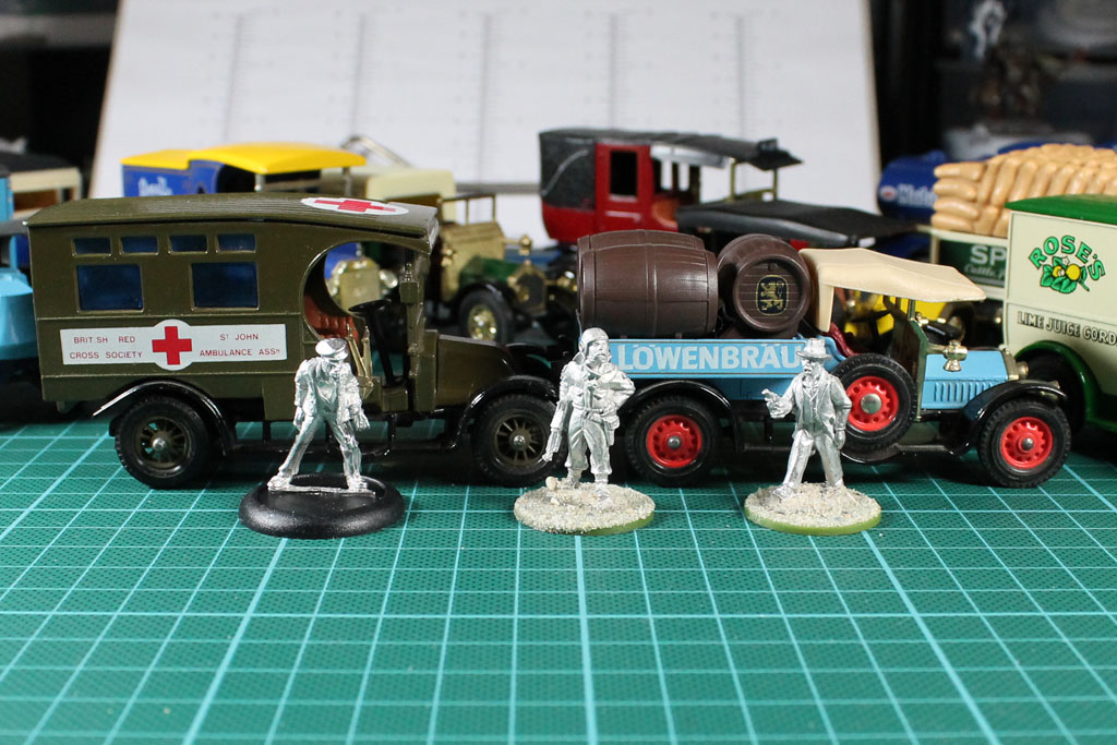 Es gibt diverse Kleinserienanbieter, wie bspw. Antenocitis Workshop die schicke Resinbausätze im 28mm Maßstab anbieten, aber als Gelände oder Sichtlinienblocker sind die Preise von 15-25 Euro pro Bausatz dann doch in einer ganz andere Liga wie die hier gezeigten 3-Euro Fahrzeuge. Zu mal auch den Tisch vollkriegen möchte.