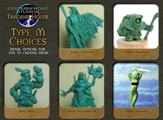 Die Miniaturen sind in Type M (menschengroß, linkes Bild) und Type L (deutlich größer) eingeteilt. Für 70$ darf man sich 15 Typ M Miniaturen aussuchen bzw. eine Anzahl dieser M-Punkte in eine Größere investieren. Die Konzeptzeichnungen rechts wurden über den Kickstarter bereits finanziert und können ebenfalls ausgewählt werden.