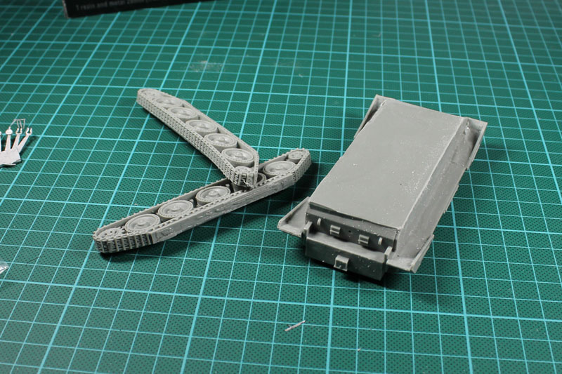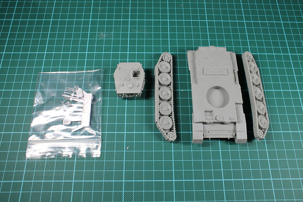 Wie üblich ist der Resin-Zinn-Bausatz in Luftpolster und Zipbag verpackt. Der Bausatz verfügt über 4 Resinteile: Turm, Wanne und die beiden Ketten. Die Zinnteile umfassen die Turmklappe, das Geschütz und diverse kleinere Anbauten wie Antennen und Scheinwerfer.