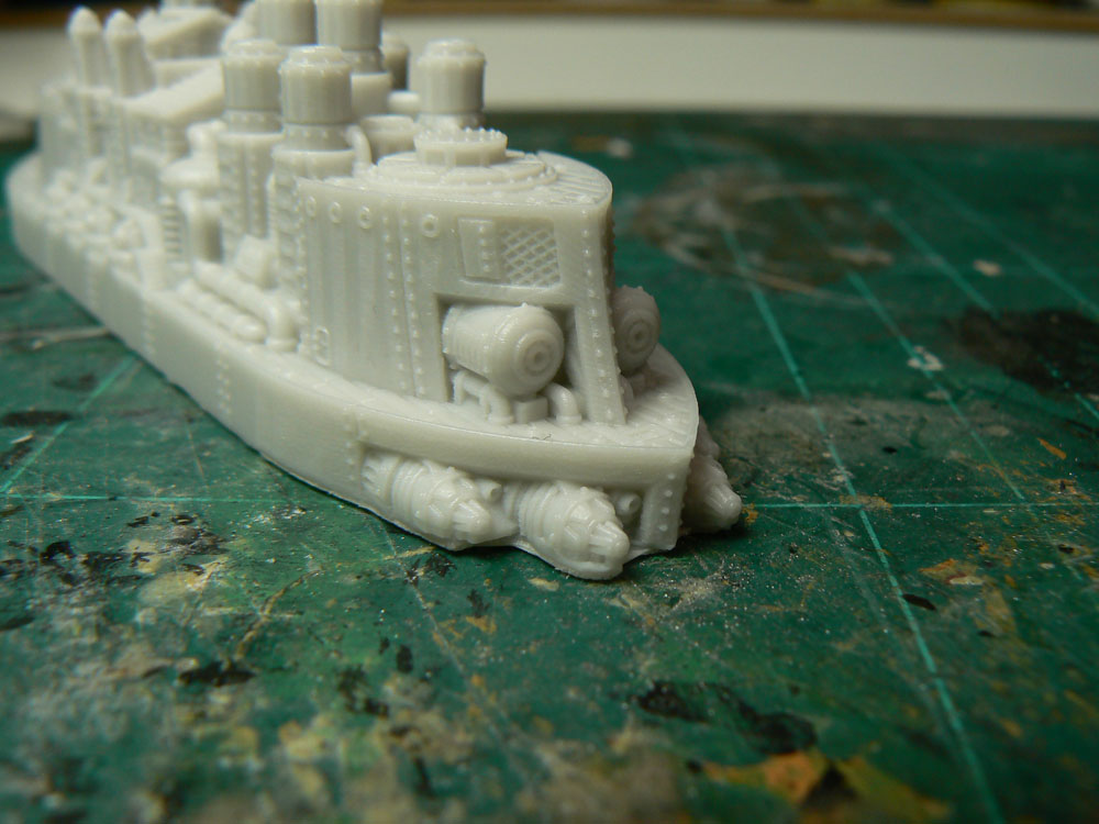 Die Zinnteile weisen leider sehr störende Gussgrate auf, die teilweise sogar „Schwimmhäute“ zwischen den Läufen der Torpedo Türme bilden. Besonders ärgerlich sind die Gussgrate in den Läufen der Torpedorohre. Hier müsste man neben der Feile noch zum Bohrer greifen um den Graten zu Leibe zu rücken.