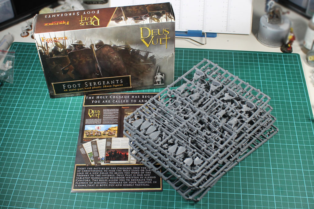 Die Box kommt mit 48 Modellen, verteilt auf 6 Gussrahmen, 2 Basegussrahmen und einem Beileger für zusammen 35 Euro. Aus den 48 Miniaturen lassen sich entweder 48 Foot Sergeants oder bis zu 24 Armbrustschützen und entsprechend viele Foot Sergeants bauen.