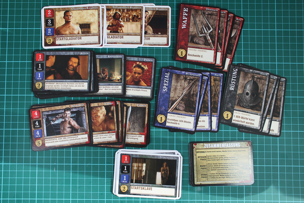 Auch die Spielkarten sind ansprechend mit verschiedenen Bildern und Graphiken aus der Serie gestaltet. Die Würfel sind 12mm groß und in 3 Farben enthalten. Ein Gladiatorenspiel darf natürlich auch nicht ohne Miniaturen auskommen, in diesem Fall 4 Stück.