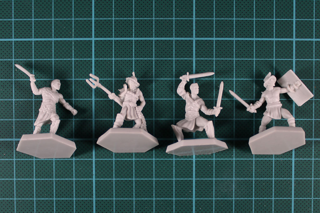Die Gladiatoren sind etwa 30mm hoch und stehen auf Hexbasen. Sie sind aus einem weichen, gummiartigen Plastik, was bspw. den Miniaturen von Descent oder der Reaper Bones Reihe ähnelt. Für ein Brettspiel ist die Gussqualität ganz stattlich. Tabletopspieler sind sicherlich mehr gewohnt, ist aber noch annehmbar und mit der entsprechenden Bemalung auch ein Hingucker.