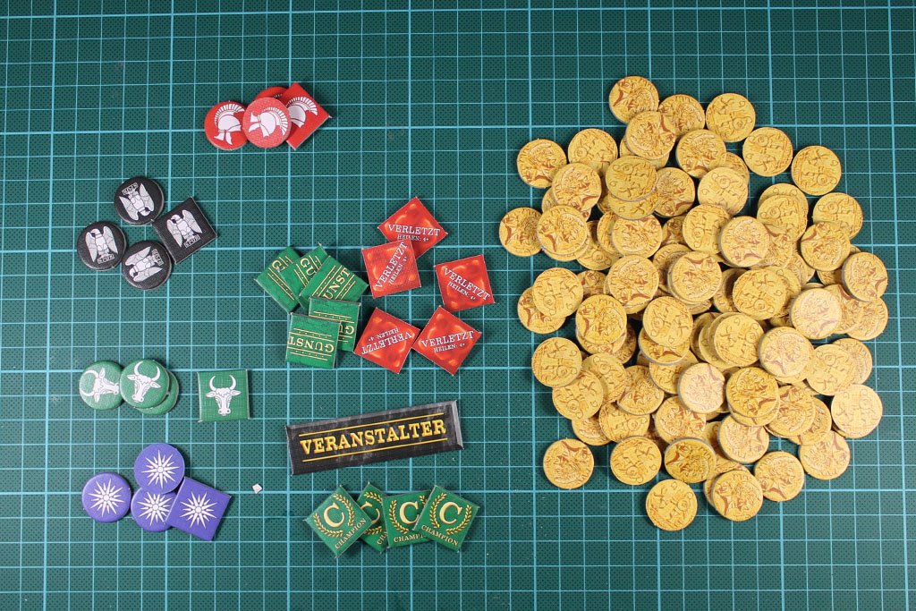 Das Spielmaterial macht einen hochwertigen Eindruck und ist auf mattem Karton gedruckt. Viele der Marker sind zweiseitig und tragen bspw. die Symbole der verschiedenen Ludi / Gladiatorenschulen, passend zur Hauskarte.