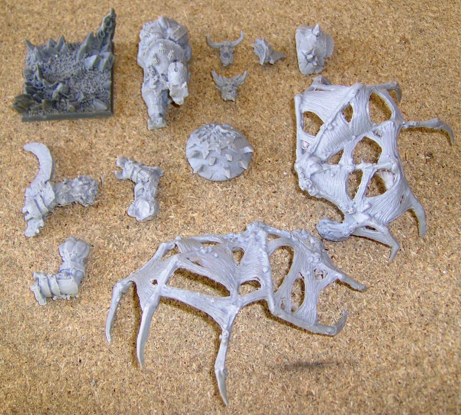 Der Behemoth kommt in einer kleinen, sehr soliden Pappkiste. Neben der Resinbase findet man darin den Torso mit Beinen, drei Arme, drei Köpfe, einen Schild, Schulterpanzerung und die Flügel. So lässt sich das Modell – anders als bei vielen Resin-Mitkonkurrenten – vom Bau an individualisieren.