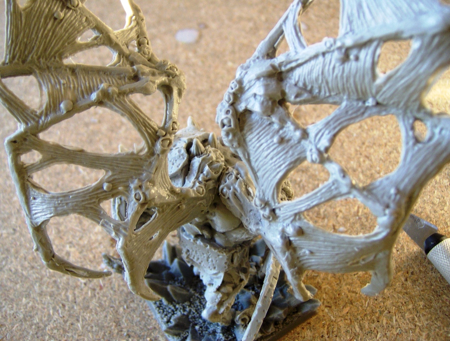 Der Rest des Modells ist weitgehend frei von Gussgraten oder –fehlern, wobei hier natürlich die narbige Haut des Dämonen eventuelle Fehler gut kaschieren kann. Kleinere Grate lassen sich mit einem Skalpell oder Bastelmesser einfach entfernen. Der Zusammenbau gestaltete sich auch ohne Anleitung sehr einfach und selbsterklärend. Die Idee das Modell so variabel wie möglich zu gestalten hat allerdings kleine Schwächen beim Verkleben, denn nicht immer ist die Klebefläche glatt und eben, teilweise muss man etwas mit Putty nachhelfen, damit Bauteile wie z.b. der Schulterpanzer nicht halb in der Luft hängen. Auf den Bildern erkennt man dies besonders gut an den Flügelansätzen. Ansonsten bleibt der Schwierigkeitsgrad überschaubar, durch das Gewicht der größeren Teile, gerade der Flügel, sollte man aber etwas Geduld mitbringen. Wer das Modell öfter transportieren möchte, ist weiterhin sicher gut damit beraten, die Flügel zu stiften.