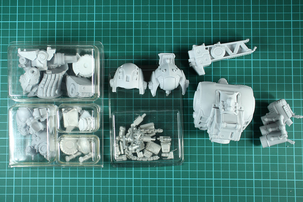 Im Bausatz sind die Teile so aufgeteilt, dass die größeren, voluminösen Teile in Resin gegossen und die Kleinteile in Zinn umgesetzt wurden. Die Probe auf Vollständigkeit wurde kurz vollzogen, auch um eine Übersicht zum späteren Zusammenbau zu erhalten. Hier fällt schon vorab ins Auge, dass man mehr Details untergebracht hat, als beim Khadorianischen Gegenstück.