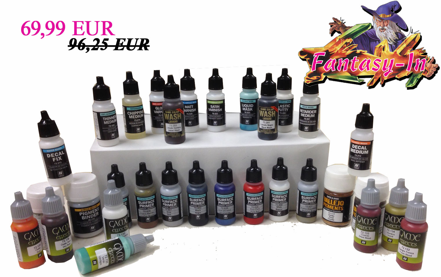 Das Vallejo Effekte Komplett Set ist eine Zusammenstellung der gebräuchlichsten und besten Farben und Medien, um einem bemalten Modell entscheidende Merkmale zu geben. Von einfachen Gebrauchsspuren über Verwitterungs- und Alterungseffekten bis zu der realistischen Darstellung von Kampfschäden. Das Set bietet Einsteigern wie auch fortgeschrittenen Malern die Möglichkeit, alle Arten von Effekten darzustellen.
