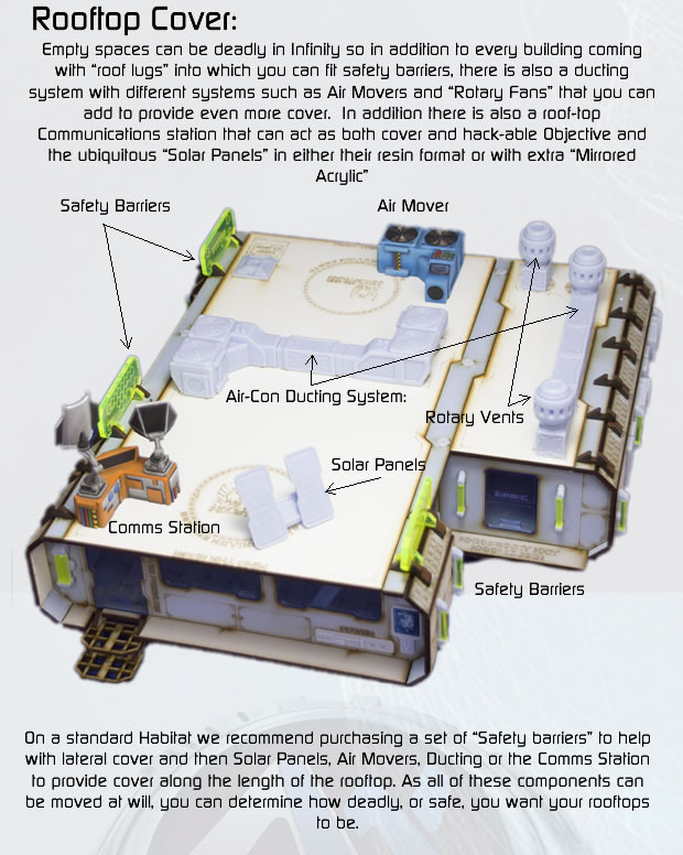 The entire set is compatible with Infinity gaming and 3rd Edition – so certain objects and features are a set size, to give cover to 1 silhouette type but not another, to provide a building structure to hide behind and with scatter to make crossing open spaces as easy or difficult as you chose to make it.