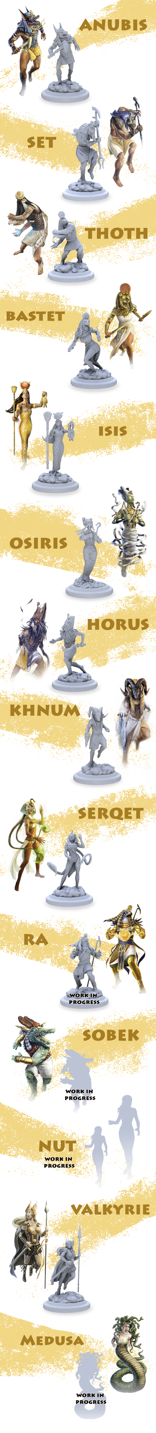 Dabei sind 12 ägyptische Götter, wie Horus und Osiris, dazu noch eine Walkyre und Medusa Erweiterung für die beiden Pantheons des Grundspiels.