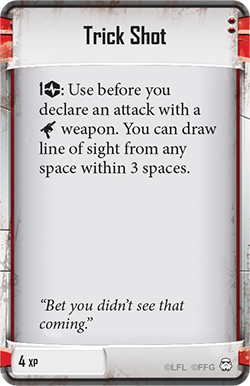 Jyn Odan’s gunfighter talents also benefit from her Class cards. Gunslinger allows Odan to trigger any of her Pistols’ surge abilities when she attacks with a Pistol. In addition, she can suffer a strain and exhaust Gunslinger to apply an extra surge to her attack results, giving her even more options for Pistol attacks. Jyn can pull off seemingly impossible shots with Trick Shot, a card that allows her to draw line of sight for a ranged attack from any space within three spaces of her actual location.