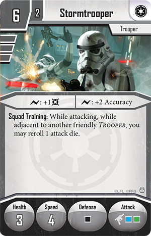 Both players receive the results shown above: the Stormtrooper has rolled four accuracy, three damage and one surge, whereas Jyn Odan has rolled one block. Ordinarily, the Stormtrooper’s attack would miss, because he needs at least six accuracy to hit Jyn. However, the Imperial player can spend the surge to trigger a surge ability shown on the Stormtrooper’s Deployment card. He triggers an ability that grants the attack two additional accuracy, bringing the total to six accuracy – a hit! One of the three damage rolled is prevented by the single block, and Jyn takes two damage from the Stormtrooper’s attack.