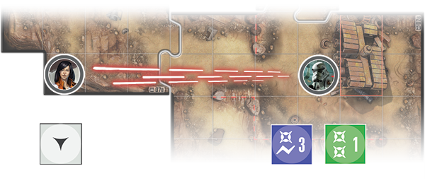 As an example of an attack, a Stormtrooper figure decides to fire at Jyn Odan, who is six spaces away from him. The Imperial player checks that his Stormtrooper has line of sight to Jyn Odan, then both players roll their combat dice at the same time. The Imperial player rolls a blue die and a green die on attack, as shown on the Stormtrooper’s Deployment card, while the Rebel player controlling Jyn Odan rolls a white die, corresponding to the die shown as Jyn Odan’s defense on her hero sheet.