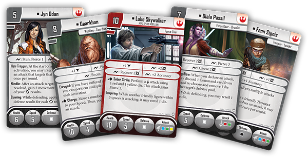 You begin building an army by spending points on Deployment cards for your army. Each player has forty points to spend, and each figure or group of figures has a cost equal to its deployment cost, shown in the upper left-hand corner of the card. A squad of Stormtroopers costs six points, but bringing Darth Vader himself into your army costs eighteen points – nearly half of your available points. The Imperial and Mercenary Deployment cards used in the campaign and introduced in two of our past previews are also used in the skirmish game, but rather than using hero sheets for characters like Fenn Signis or Jyn Odan, there are Rebel Deployment cards for each hero. Heroes in a skirmish mission follow the same rules as all other figures – they cannot rest, and only one attack can be made per activation.