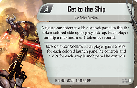The other path to gaining victory points is to complete the specific goals given by the mission. Two missions corresponding to every skirmish mission map in Imperial Assault, each with very different objectives. For example, on the Mos Eisley Outskirts map, there are two possible missions: Get to the Ship and Smuggled Goods.