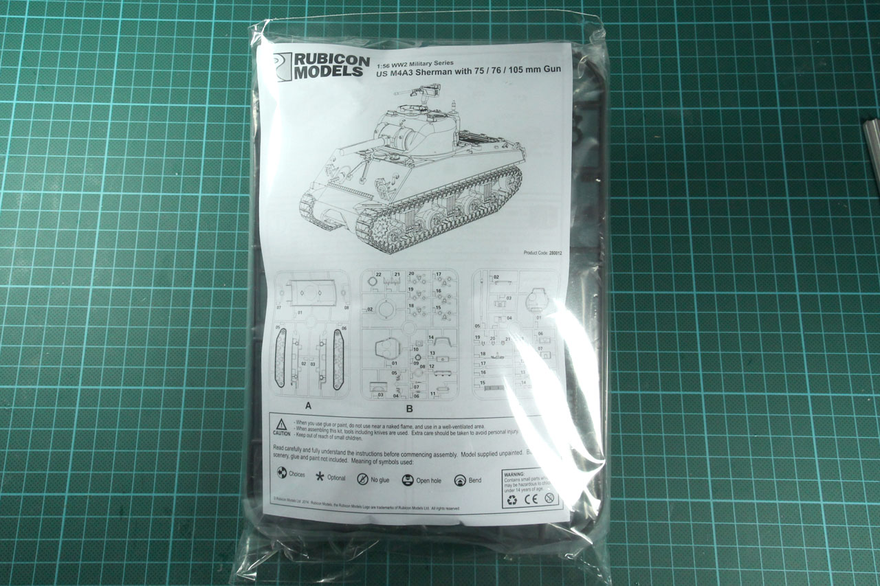 Rubicon verpackt die Bausätze normalerweise in Boxen, wir haben allerdings eine Vorabversion in Klarsichtbeuteln erhalten. Darin befinden sich 3 Plastikgussrahmen, eine Bauanleitung und Wasserschiebebilder. Der Sherman (Variantenübergreifend) wurde knapp 50.000 mal hergestellt und die hier vorgestellte Version M4A3 wurde über den zweiten Weltkrieg hinaus auch im Koreakrieg eingesetzt.
