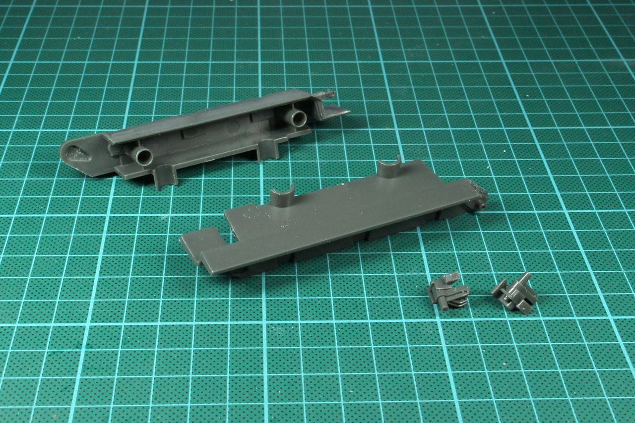 Beginnend bei den Ketten, startet der Bau. Die Türme haben wir bewusst als letzte Baugruppe gefertigt. Hier fällt die Aufteilung auf mehrere Einzelteile positiv ins Gewicht, dadurch wirkt diese Sektion detaillierter und sauberer als bspw. bei Resinfahrzeugen. Die Kettenlauffläche ist recht glatt, weshalb hier mit Schleifpapier bzw. einer Feile die Oberfläche etwas aufgeraut wurde um die spätere Haftung der Farbe zu verbessern (die Unterseite der Ketten ist die Fläche, mit der höchsten Reibung in der späteren Handhabung als Spielfigur).