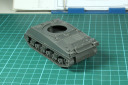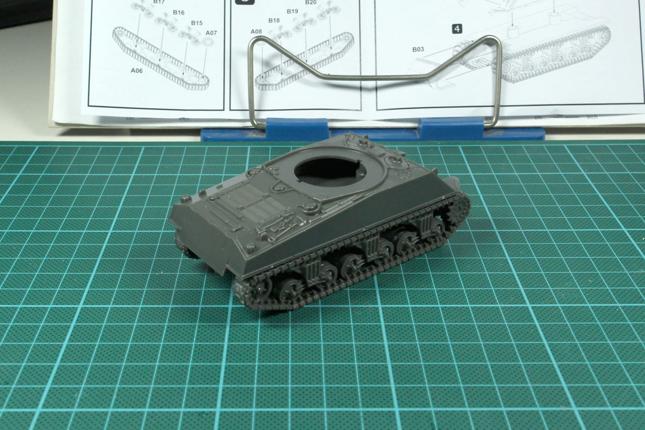 Die Wanne verfügt über die typische eckige M4A3 Form, und ist hinten historisch korrekt angewinkelt. Allerdings ohne hintere Kettenabdeckung, welche bei vielen M4A3 Sherman zu finden war (ist eine Bauvariante). Schönes Detail ist die Mikrostruktur auf der Oberseite der Wanne.