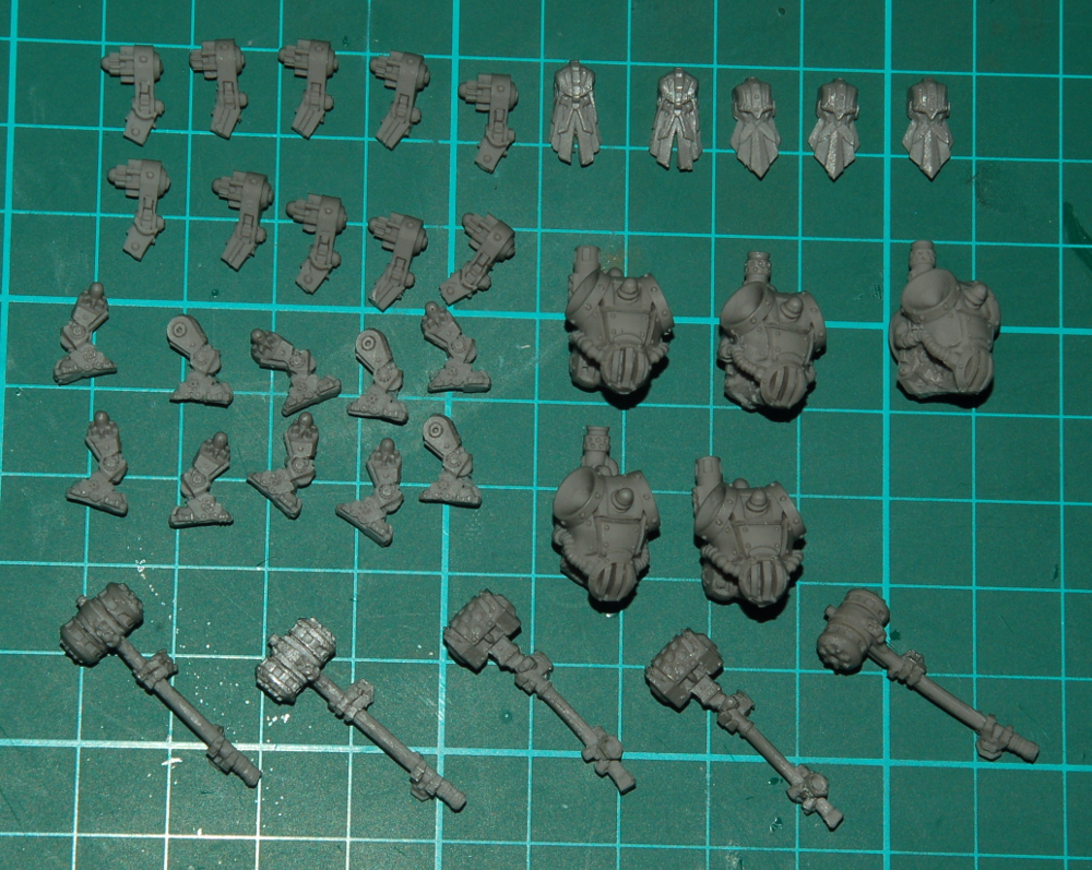 Die fünf Anvilborn Warriors kam in einer kleinen Box, und bestehen aus jeweils einem Kopf in zwei Ausführungen, zwei verschiedenen Torsi, dazu für jedes Modell zwei Beine, zwei Arme und die Zweihandhämmer mit eben jenen Händen bereits angegossen.