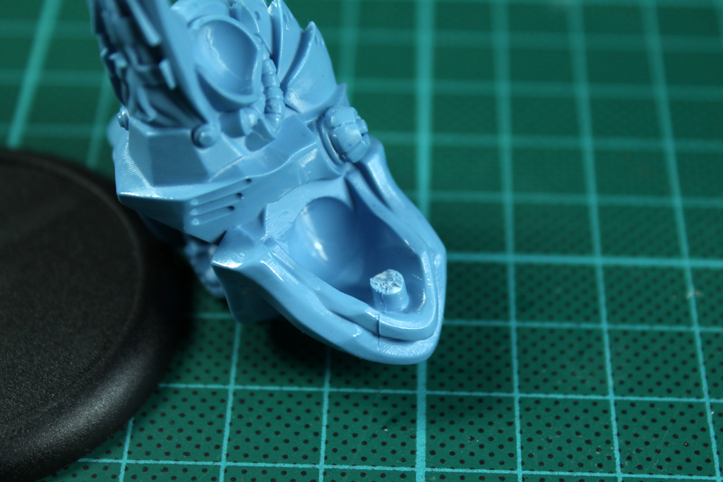 Verglichen mit den Troopern und Inquisitoren wirkt der Judicator etwas detailarm. Die großen, glatten Flächen wirken etwas leer und die Ansätze für den Gussast sind erneut ungünstig gewählt. In der Innenseite der Schulterpanzer kann man nur schwer nacharbeiten. Das sorgt für Frust, aber wir haben ja die Luftpolsterfolie. *Plop*