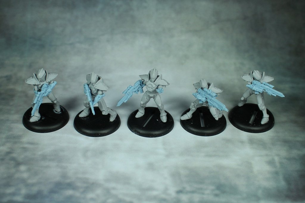 Während die Trooper zügig vom Gussast entfernt werden können, und hier nur sehr dünne, durchsichtige Gusshäutchen überbleiben, gestaltet sich dies bei den Waffen schwieriger. Diese verfügen über Hohlkehlen als Klebepunkte für die Arme. Der Übergang ist auf der Höhe der Ellenbogen gewählt und die Aussparung häufiger zugegossen bzw. nicht klar abgrenzbar, weshalb hier mit Geduld, einem feinen Bohrer und Feile nachgearbeitet werden musste.