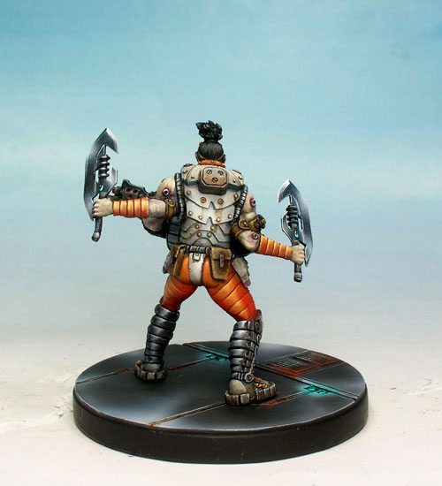 The first character shown here is Gemma, AKA Big Sister. Gemma is a Kaliyama class clone, grown from servitor vats specifically for gladiatorial entertainment. She has four arms, the upper, designed for strength and power, carry a heavy auto-shotgun. Her lower arms, built for speed and dexterity each bear Scather industrial cutters. She’s shown on a 50mm base – so she’s quite imposing.